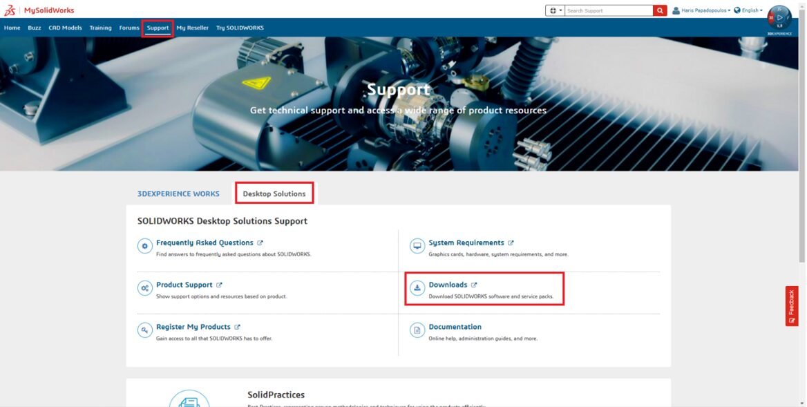 Στη συνέχεια, εάν διαθέτετε λογαριασμό MySOLIDWORKS ID, συνδεθείτε χρησιμοποιώντας τα διαπιστευτήριά σας και επιλέξτε την κατηγορία Support.