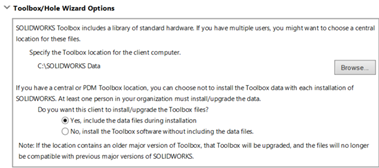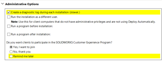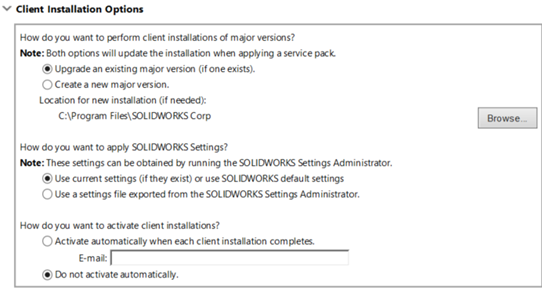 Μπορείτε επίσης να εγκαταστήσετε με τα SOLIDWORKS Default options ή να χρησιμοποιήσετε ένα .sldreg file που δημιουργήθηκε μέσω του Copy Settings Wizard. Επίσης μπορείτε να καθορίσετε αν το client machine θα ενεργοποιήσει το SOLIDWORKS license του αυτόματα.