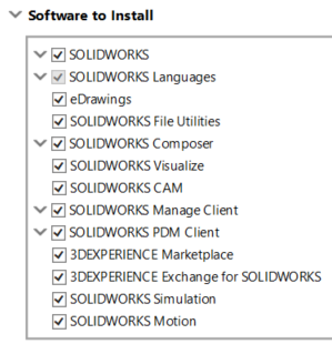 4. Software to install. Εδώ καθορίζονται ποια προϊόντα SOLIDWORKS θα περαστούν στο Client Machine.