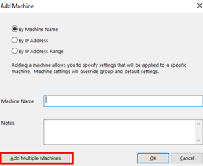 Στο επόμενο dialog box, μας επιτρέπει να βάλουμε το όνομα του PC , IP address ή rage of IP addresses. Κάνοντας κλικ στο Add Multiple Machines κάτω αριστερά ανοίγει ένα διαφορετικό και πιο εύχρηστο interface όταν θέλουμε να εισάγουμε πολλά machines στο group.