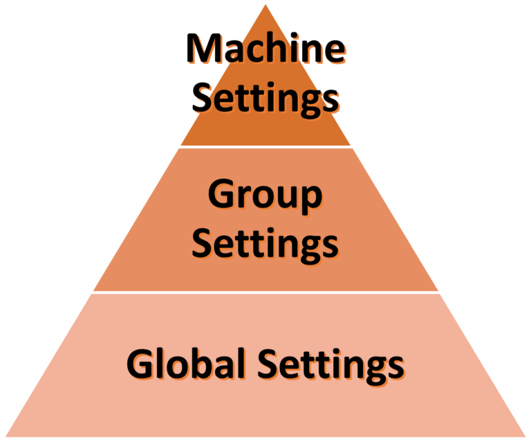 Οι προκαθορισμένες ρυθμίσεις είναι οι Global Settings, και είναι οι ρυθμίσεις για όλους τους χρήστες. Επομένως, όλα τα Settings έχουν σαν αρχή τα higher level settings, το οποίο σημαίνει ότι τα global settings και τα group settings μπορούν να γίνουν override από τα machine settings (Δες σχεδιάγραμμα – πυραμίδα). Επομένως υπάρχει μια ιεραρχία που καθιστά τα machine settings στην κορυφή της πυραμίδας, με τα group settings να ακολουθούν και τέλος τα global settings που αποτελούν την βάση.