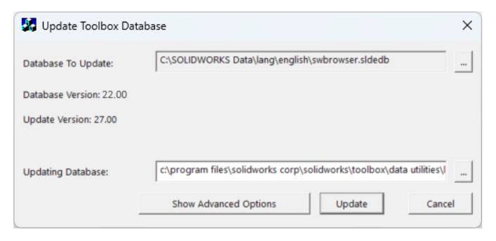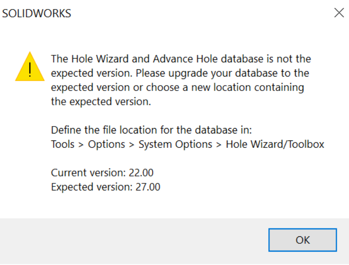Πολλές φορές έπειτα από μία αναβάθμιση του SOLIDWORKS, το toolbox παραμένει στην προηγούμενη έκδοση. Αυτή η συμπεριφορά μπορεί να παρατηρηθεί σε περιπτώσεις ενός κοινόχρηστου Toolbox όπου βρίσκεται αποθηκευμένο σε δικτυακή τοποθεσία. Ως αποτέλεσμα είναι να εμφανιστεί το ακόλουθο προειδοποιητικό μήνυμα: «Τhe Hole Wizard and Advance Hole Database is not the expected version…». Αυτό υποδεικνύει ότι η βάση δεδομένων του Hole Wizard και του Toolbox δεν βρίσκονται στη σωστή έκδοση, επομένως θα πρέπει να ενημερωθεί στην ίδια έκδοση που έχει το SOLIDWORKS.