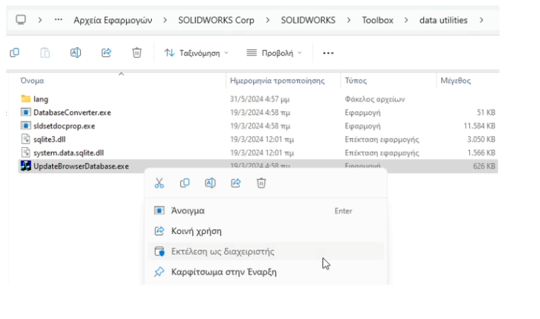 - Αναζητήστε το UpdateBrowserDatabase.exe στη διαδρομή C:\Program Files\SOLIDWORKS Corp\SOLIDWORKS\Toolbox\data utilities.