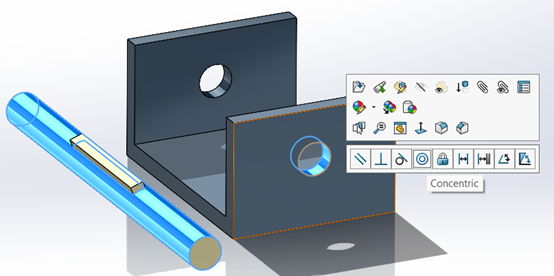 Με Ctrl πατημένο παρατεταμένα επιλέγουμε τις δύο κυλινδρικές επιφάνειες των 2 εξαρτημάτων ώστε να δημιουργήσουμε concentric mate. Μόλις αφήσουμε το Ctrl εμφανίζεται το παράθυρο με τις επιλογές των mates. Επιλέγουμε το Concentric και πατάμε Enter.