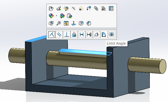 Τέλος θα προσθέσουμε ένα Limit angle mate μεταξύ των επιφανειών που φαίνονται στην εικόνα. Επιλέγουμε τις επιφάνειες με Ctrl πατημένο και αφήνοντάς το, στο παράθυρο που ανοίγει επιλέγουμε το Limit angle.