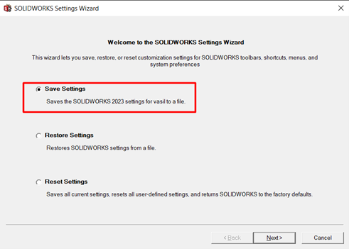 Αφού ολοκληρώσετε τη διαδικασία της εξατομίκευσης των ρυθμίσεων σας όπως toolbars, menus, shortcuts και system options μπορείτε, να αποθηκεύσετε όλες αυτές τις ρυθμίσεις ώστε σε περιπτώσεις που έχουμε crashes ή χρειαστεί να μεταφέρουμε τις ρυθμίσεις μας σε άλλον υπολογιστή που έχει το SOLIDWORKS εγκατεστημένο, να μη χρειάζεται να τις ορίζουμε από το μηδέν. Για το λόγο αυτό υπάρχει ο Copy Settings Wizard. Η εφαρμογή αυτή σας επιτρέπει να αποθηκεύσετε ή να επαναφέρετε τις εξατομικευμένες ρυθμίσεις σας για τα toolbars, shortcuts, menus και system preferences του SOULIDWORKS, ενώ ταυτόχρονα μπορεί να επαναφέρει το πρόγραμμα στις εργοστασιακές του ρυθμίσεις. Θα μπορούσε να πει κανείς ότι θυμίζει ένα backup των ρυθμίσεων μας.