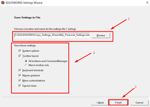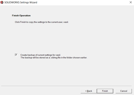 6. Είναι δυνατό να δημιουργήσετε και ένα backup file με τις τρέχουσες ρυθμίσεις του SOLIDWORKS για την περίπτωση που θέλουμε να γυρίσουμε στις προηγούμενες ρυθμίσεις. Αυτό το Backup file είναι επίσης ένα .sldreg αρχείο προερχόμενο από τον copy settings wizard.