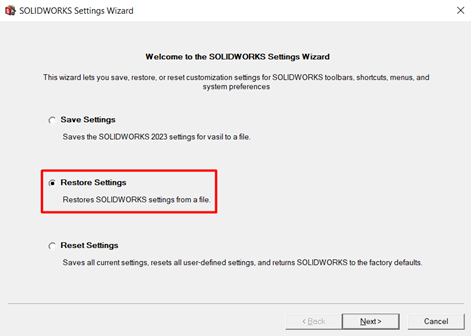 O copy settings wizard χρησιμοποιείται και για την αποθήκευση αλλά και για την επαναφορά των ρυθμίσεων σε έναν υπολογιστή που έχει εγκατεστημένο το SOLIDWORKS. Στο άρθρο αυτό θα δούμε με τη σειρά και τις 2 επιλογές. Η διαδικασία save settings ξεκινά από το βήμα 2 ενώ η διαδικασία restore settings ξεκινά από το βήμα 4.