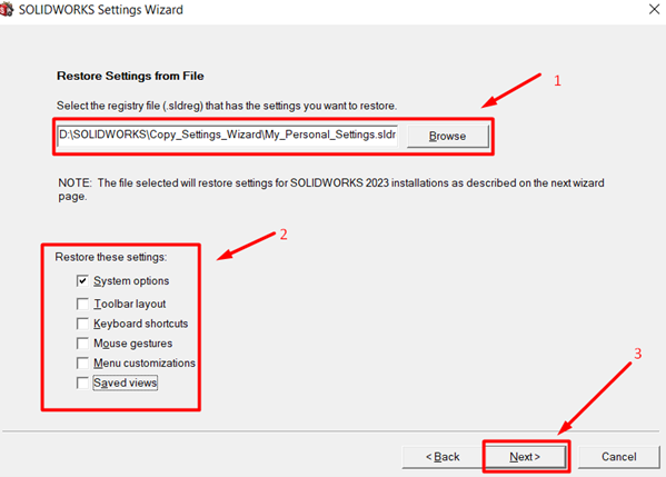 5. Επιλέξτε το αρχείο .sldreg που επιθυμείτε να επαναφέρετε. Θα παρατηρήσετε ότι μόνο τα settings τα οποία είχαμε αποθηκεύσει είναι διαθέσιμη στο αρχείο αυτό για επιλογή. Όταν επιλέξετε ότι επιθυμείτε πατήστε Next.