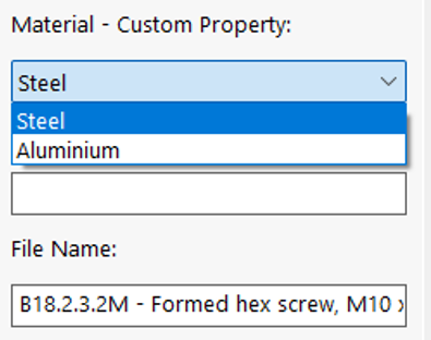 Αν εισάγουμε το εξάρτημα σε κάποιο assembly, βλέπουμε πως πλέον στο Property Manager εμφανίζεται το Material – Custom Property. Στην αναδιπλούμενη λίστα μπορούμε να επιλέξουμε μεταξύ του Steel και του Aluminium που δημιουργήσαμε.