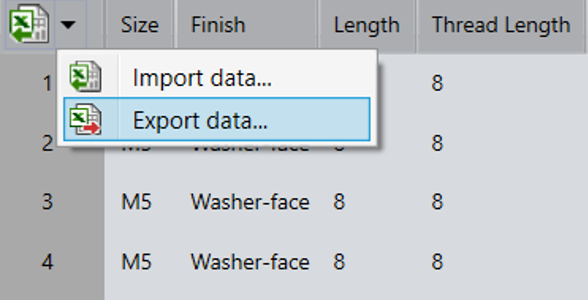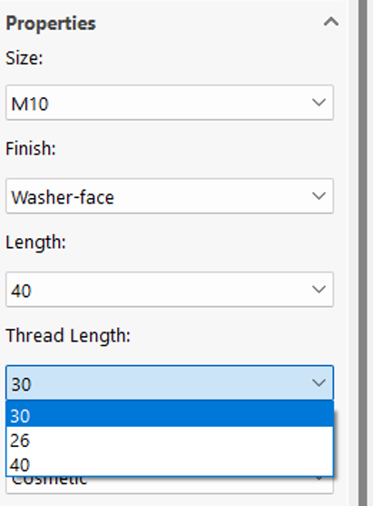 Έχοντας σώσει τις παραπάνω αλλαγές, εισάγουμε το συγκεκριμένο εξάρτημα σε ένα assembly. Παρατηρούμε πως στο property manager στο πεδίο Thread Length εμφανίζεται πλέον η επιλογή 30 την οποία δημιουργήσαμε προηγουμένως.