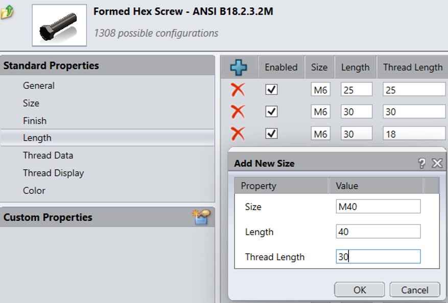 Κάνοντας κλικ πάνω στο εξάρτημα Formed Hex Screw – ANSI B18.2.3.2M, το οποίο βρίσκεται στο Company’s folder που μόλις δημιουργήσαμε, μπορούμε να δούμε όλα του τα properties και να προσθέσουμε νέα.