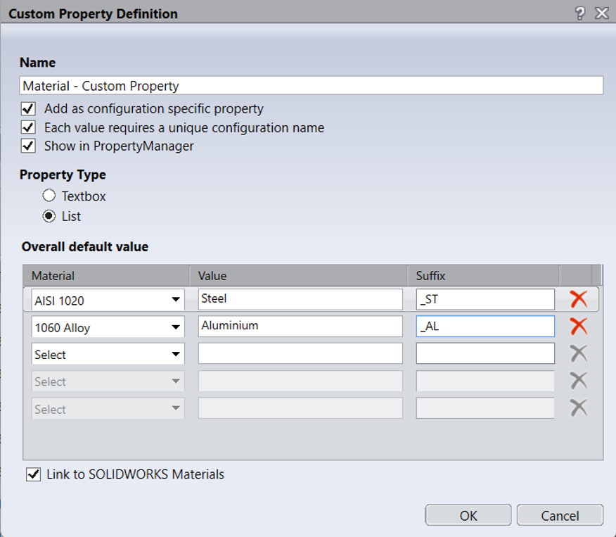 Στο συγκεκριμένο παράδειγμα το ονομάζουμε Material – Custom Property, ενεργοποιούμε τις 3 επιλογές και επιλέγουμε List όπως φαίνεται στην εικόνα. Έχοντας ενεργοποιήσει το «Link to SOLIDWORKS Materials» μπορούμε στη στήλη Material να επιλέξουμε υλικό από το SOLIDWORKS. Έπειτα στη στήλη Value εισάγουμε τιμή και στο Suffix το επίθεμα το οποίο θα εμφανίζεται στο τέλος της περιγραφής σε κάθε Configuration Name.