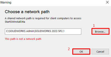 3. Ορίστε την διαδρομή στο δίκτυο που βρίσκεται το administrative image installation directory. Τυπικά, η διαδρομή για το administrative image installation directory φαίνεται σαν windows file path (πχ: C:\SOLIDWORKS Admin\SOLIDWORKS 2023 SP2). Ωστόσο το dialog box γράφει This path is not a network path.
