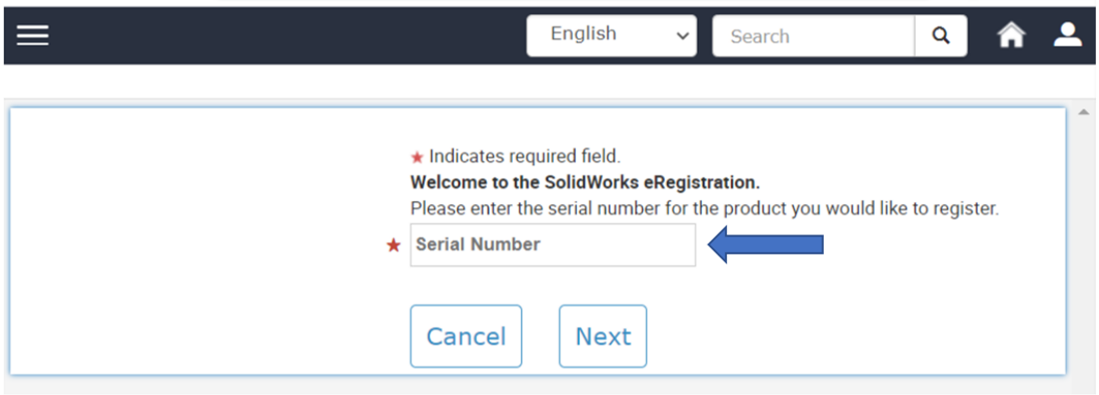 2. Πληκτρολογήστε το σειριακό σας αριθμό SOLIDWORKS και επιλέξτε Next.