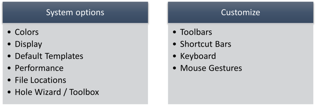 Θα ξεκινήσω με την πιο «ατομική» ρύθμιση. Δεν είναι άλλη από το να διαμορφώσετε το περιβάλλον του SOLIDWORKS. Μπορείτε να επηρεάσετε τόσο το αισθητικό κομμάτι του προγράμματος όσο και το λειτουργικό κομμάτι αυτού. Κύρια πηγή για την εξατομίκευση του περιβάλλοντος του SOLIDWORKS είναι τα options και το customize. Εδώ μπορείτε να κάνετε πολλές αλλαγές, μερικές ενδιαφέρουσες ρυθμίσεις εξατομίκευσης είναι οι εξής
