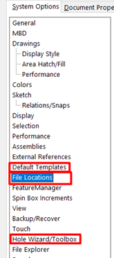 Ο λόγος που αποτελεί δική της κεφαλίδα αυτή η ρύθμιση οφείλεται στο γεγονός ότι πρέπει να λάβουμε υπόψη μας το αν θα δουλέψουμε σε collaborative environment ή γενικά άμα θέλουμε σε συγκεκριμένη θέση όλα τα δεδομένα μας. Ιδιαίτερα στην 1η περίπτωση, ορίζοντας τα σωστά file locations εξασφαλίζουμε ότι όλοι οι συνεργάτες μας χρησιμοποιούν τα ίδια company standards. Τα Default Templates, τα File Locations και το Hole Wizard / Toolbox αποτελούν μέρος των system options. Αυτές οι διαδρομές μπορούν να οδηγούν και μέσα στο Vault αν έχουμε PDM. Μερικά από τα συνηθέστερα file locations που αξίζει να σημειωθούν είναι:
