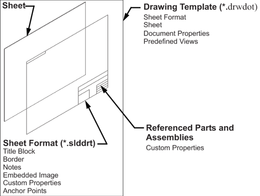 Ιδιαίτερα για τα Drawing Templates, θα πρέπει να δώσουμε μια επιπλέον φροντίδα. Ένα drawing template αποτελείται από το Sheet Format, τα Document Properties, το Sheet και μπορεί να διαθέτει και Predefined views. Όσον αφορά το Sheet Format υπάρχουν κάποια επιπλέον θέματα που πρέπει να λάβετε υπόψη σας.