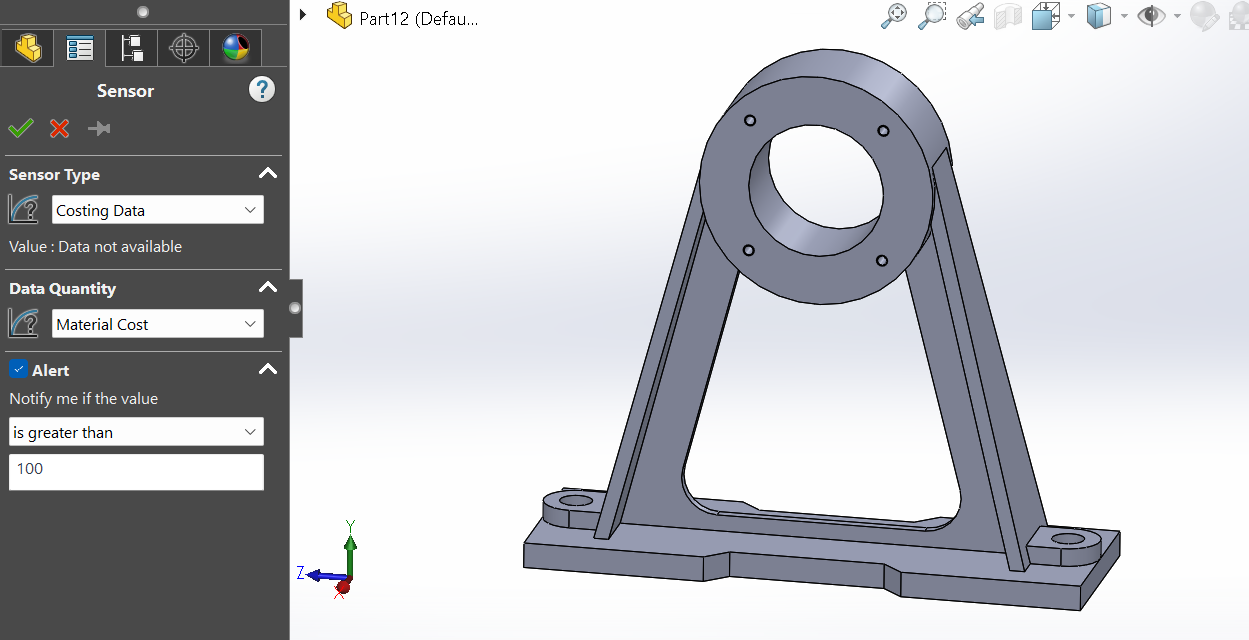 Προστέθηκε στο SOLIDWORKS 2015, το costing data sensor μπορεί να χρησιμοποιηθεί με συγκεκριμένες ποσότητες: συνολικό κόστος, κόστος υλικού ή κόστος κατασκευής.