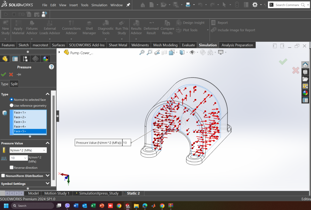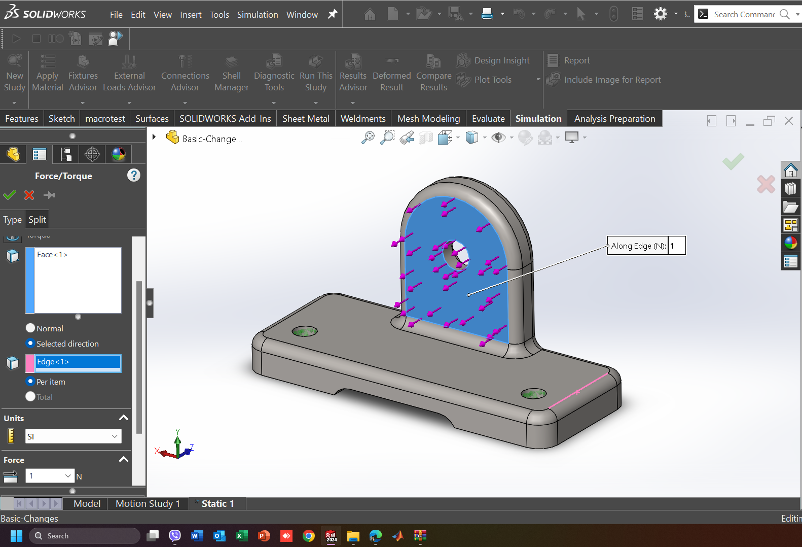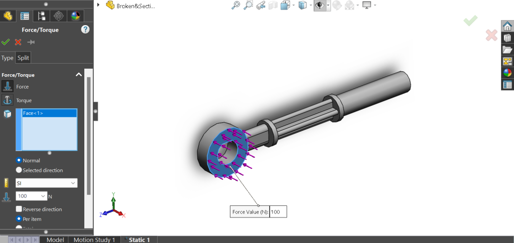 Για την εφαρμογή μίας απλής δύναμης μέσω της επιλογής Force load, ο χρήστης απλά επιλέγει την επιφάνεια ή την ακμή ή ακόμα και το σημείο εφαρμογής της δύναμης, και τέλος το μέγεθος της δύναμης. Παρακάτω φαίνεται αναλυτικά η διαδικασία με την οποία εφαρμόζεται μία δύναμη στο μοντέλο.
