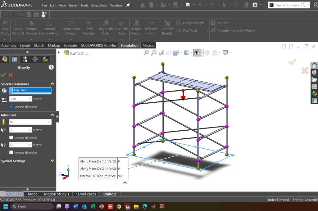 Όταν επιλεχθεί η θέση (ή οι θέσεις) των φορτίων, υπάρχουν κάποιες default διευθύνσεις που ακολουθεί η φορά της δύναμης. Παραδείγματος χάρη αν επιλεχθεί μία επιφάνεια σαν σημείο εφαρμογής της δύναμης, αυτή θα είναι κάθετη σε αυτή την επιφάνεια εκτός και αν ο χρήστης αλλάξει τον προσανατολισμό αυτό. Αυτή η τροποποίηση μπορεί να γίνει επιλέγοντας μία ακμή ή μία επιφάνεια αναφοράς, και από εκεί να χρησιμοποιηθούν 3 διαφορετικές διευθύνσεις ως προς αυτή την επιλογή.