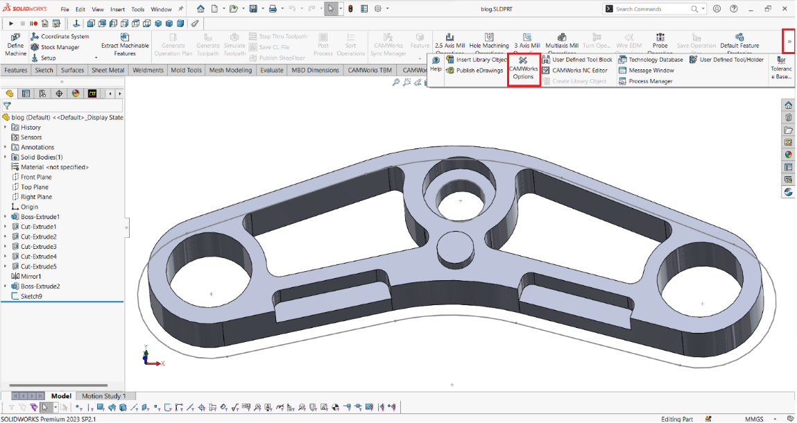 Για τις κατεργασίες 2.5 αξόνων το SOLIDWORKS μπορεί να δημιουργήσει αυτόματα τα απαραίτητα χαρακτηριστικά για να προετοιμάσει το εξάρτημα για την δημιουργία των κατεργασιών. Πρώτα από όλα, πρέπει να ορίσετε κάποια επιλογές μέσα από τα Options.