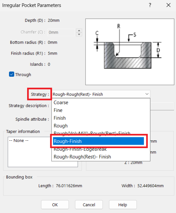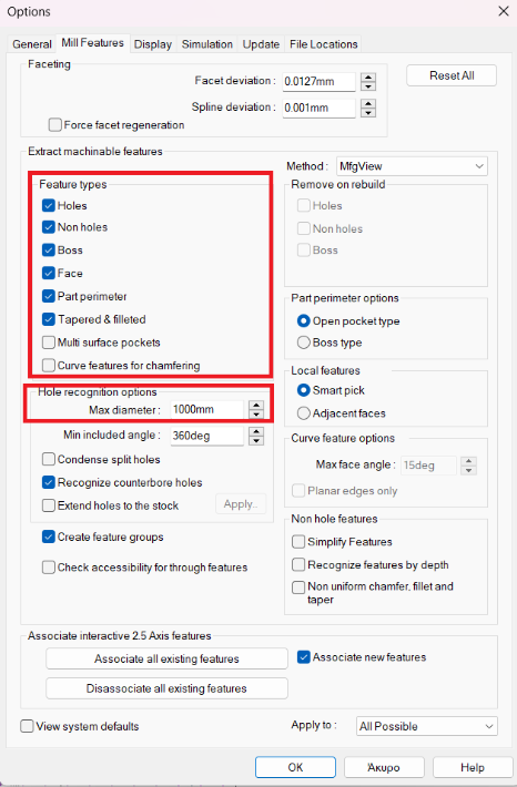 Στο παρακάτω παράθυρο έχετε την δυνατότητα να πείτε εσείς στο πρόγραμμα, το είδος των χαρακτηριστικών που θέλετε να αναγνωρίσει αυτόματα. Στην επιλογή ‘’Max Diameter’’ από το Hole recognition options το μεγαλύτερο μέγεθος της οπής που πρόκειται να γίνει με κατεργασία Drill. Οπές με μεγαλύτερη διάμετρο από αυτή την τιμή θα γίνονται με κατεργασία end mill.