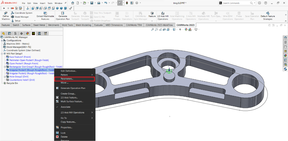 Για να καταφέρετε να αλλάξετε την στρατηγική της κατεργασίας με αυτήν που επιθυμείτε πρέπει να κάνετε δεξί κλικ στο χαρακτηριστικό που θέλετε να τροποποιήσετε και να επιλέξτε την επιλογή ‘’Parameters’’.