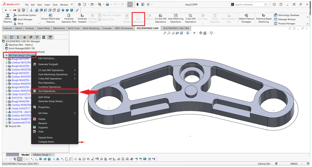 Η δυνατότητα ‘’ Sorting Operations’’ που διαθέτει το SOLIDWORKS CAM είναι μια απλή διαδικασία που ταξινομεί την σειρά των κατεργασιών με συγκεκριμένο τρόπο που θα ορίσετε εσείς. Για να ορίσετε την σειρά αυτή πρέπει να κάνετε αριστερό κλικ στο Sort στη διαχείριση εντολών CAM ή με το δεξί ποντίκι στο Mill Part Setup1 και επιλέξτε Sort Operations.