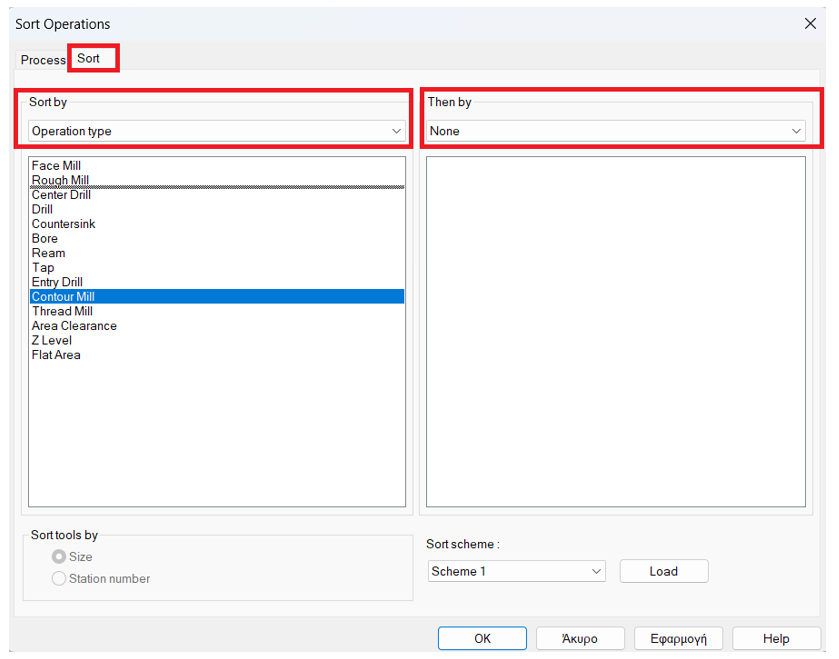 Μόλις το επιλέξετε θα εμφανιστεί η παρακάτω καρτέλα. Στην καρτέλα Sort μπορείτε να αναδιατάξετε τις κατεργασίες είτε μες βάση το είδος της κατεργασίας ή με βάση το κοπτικό εργαλείο. Το μόνο που έχετε να κάνετε είτε με τον ένα τρόπο είτε με τον άλλον είναι με drag and drop να βάλετε την κατεργασία στην θέση που επιθυμείτε. Επίσης, έχετε την δυνατότητα να ορίσετε την σειρά να γίνετε πρώτα με βάση τις κατεργασίες και μετά με βάση το κοπτικό εργαλείο από το πεδίο ‘’Then by’’.