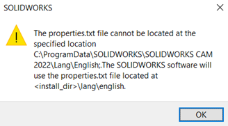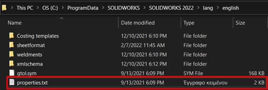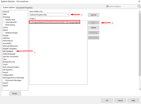 Αρχικά πρέπει να ελέγξουμε ότι το SOLIDWORKS διαβάζει το αρχείο από τη σωστή θέση: C:\ProgramData\SOLIDWORKS\SOLIDWORKS 20ΧΧ\lang\english. Αυτό μπορεί να ελεγχθεί μέσω του Tools > Options > System Options > File Locations. Στο drop down menu επιλέγουμε “Custom Property Files”. Σιγουρευτείτε ότι βρίσκεστε στη σωστή διαδρομή και στη σωστή έκδοση του SOLIDWORKS (πχ 2022).