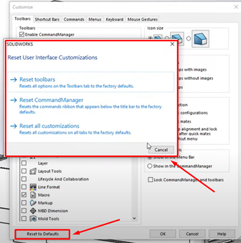 Το SOLIDWORKS φημίζεται για το πόσο εύκολα μπορεί να εξατομικευθεί στις ανάγκες του χρήστη. Στην περίπτωση που κάποιος θέλει να επαναφέρει το περιβάλλον σχεδιασμού του στις εργοστασιακές ρυθμίσεις, μπορεί να επιλέξει την εντολή Reset Defaults η οποία βρίσκεται στο customize window. Μας δίνεται η δυνατότητα να κάνουμε Reset τα Toolbars και τον Command Manager μεμονωμένα ή και τα 2 ταυτόχρονα με ένα κλικ.