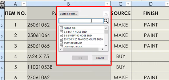 Δεν υπάρχουν αρκετά λόγια για να περιγράψω το πόσο χρήσιμη είναι αυτή η καινούρια προσθήκη για τους χρήστες του SOLIDWROKS. Στην πρώτη θέση έχουμε την καινούρια δυνατότητα που μας δίνουν τα SOLIDWORKS Drawings, να κάνουμε filtering χρησιμοποιώντας spreadsheet controls τα οποία μας είναι γνωστά και οικεία από παρόμοιες εφαρμογές. Τα φίλτρα μας δίνουν τις επιλογές σαν checkboxes ενώ ταυτόχρονα υπάρχει και η δυνατότητα για αναζήτηση κάνοντας την εξεύρεση των ζητουμένων φίλτρων πιο εύκολη.Custom filters μπορούν να οριστούν και με την βοήθεια conditional logic. Τα balloons που δεν εμφανίζονται κατά το filtering του table εξαφανίζονται και από το view το οποίο σχετίζεται με το table.