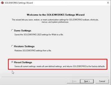 Ταυτόχρονα, ο Copy Settings Wizard λαμβάνει μια παρόμοια αναβάθμιση κατά την οποία ο χρήστης, πέρα από τις ήδη γνωστές λειτουργίες, μπορεί να επιλέξει να κάνει Reset Settings, αποθηκεύοντας τις εξατομικευμένες ρυθμίσεις ενώ ταυτόχρονα επιστρέφει το SOLIDWORKS στις εργοστασιακές του ρυθμίσεις.