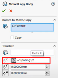 Η εντολή Move Copy / Bodies λαμβάνει μια σημαντική ενίσχυση, η οποία εισάγει διαστάσεις τις οποίες ο χρήστης μπορεί να τις τροποποιήσει άμεσα και γρήγορα. Πλέον μπορούμε να ορίσουμε τις διαστάσεις μετακίνησης και περιστροφής με την βοήθεια equations, design tables αλλά και με configurations, σώζοντας μας χρόνο όταν τα σχέδια απαιτούν τροποποιήσεις.