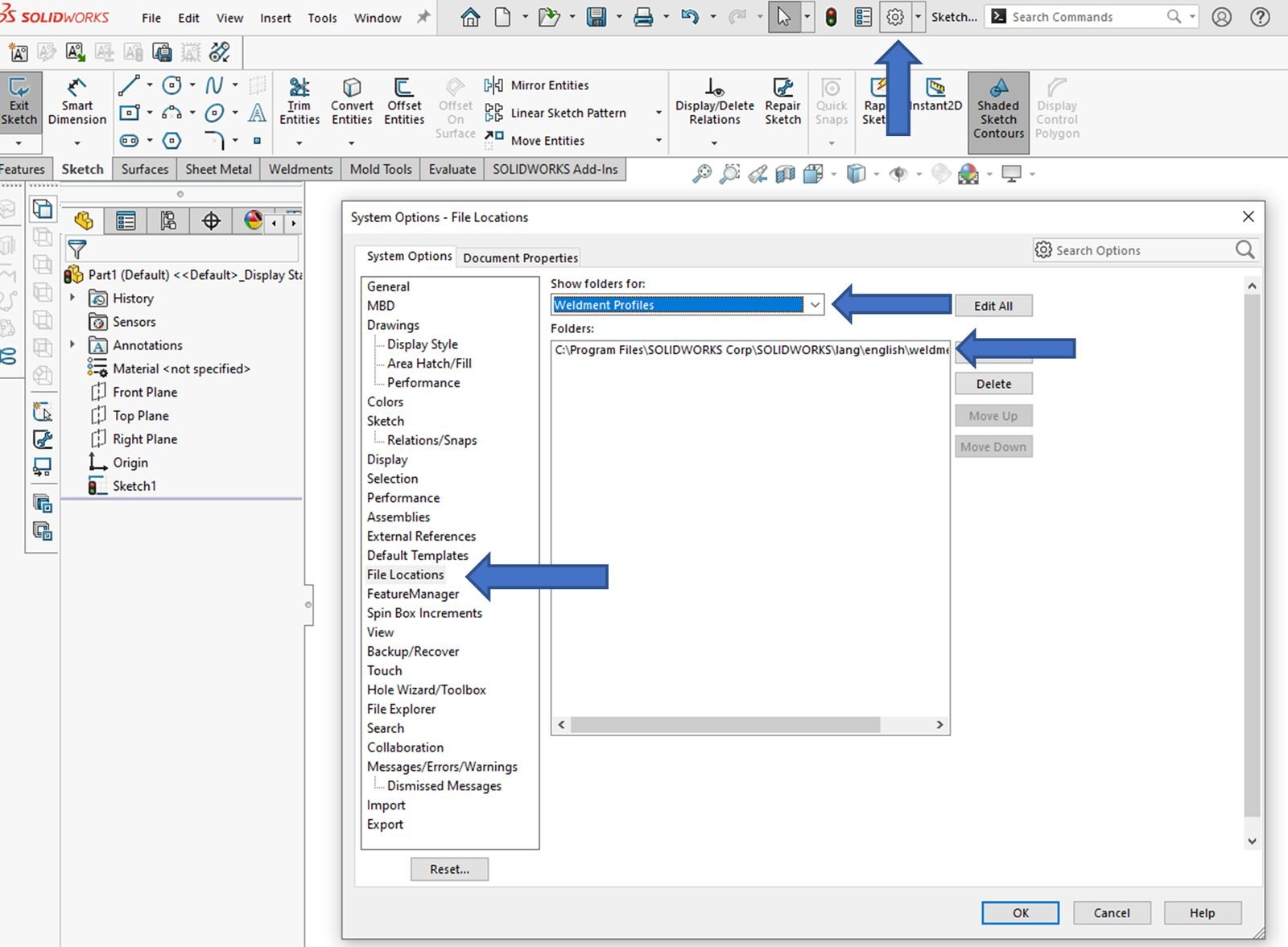 Βήμα 2. Στη συνέχεια πρέπει να αναζητήσετε τη διαδρομή για τον φάκελο των weldments profiles.Για να το πετύχετε αυτό πηγαίνετε στην καρτέλα Options, μετά επιλέξτε file locations και στο Show folders επιλέξτε “Weldment Profiles”.Μόλις το επιλέξετε θα σας εμφανίσει παρακάτω τη διαδρομή της θέσης του φακέλου.