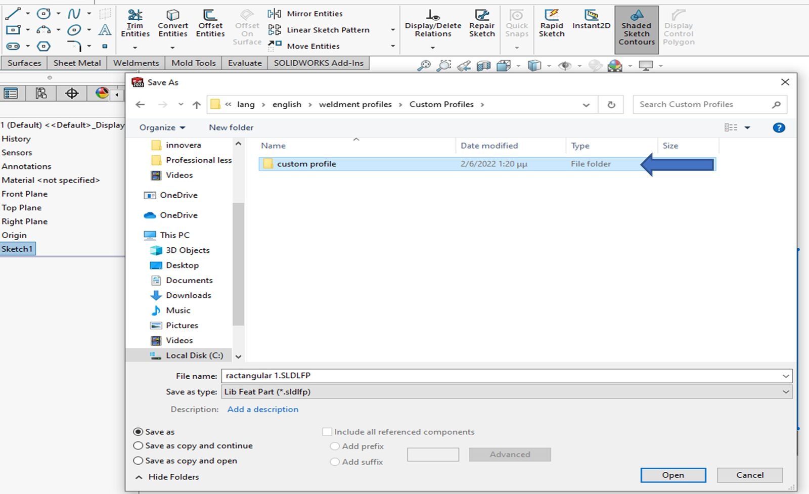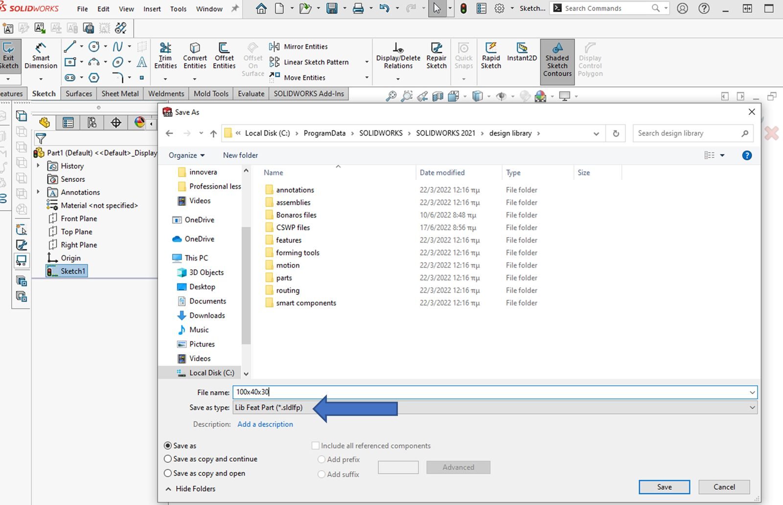 Στο Save as type πρέπει να επιλέξετε το Lib Feat Part(*.Sldlfp) και αναζητήστε το φάκελο με τα weldment profiles στη διαδρομή που δείξαμε στα προηγούμενα βήματα.