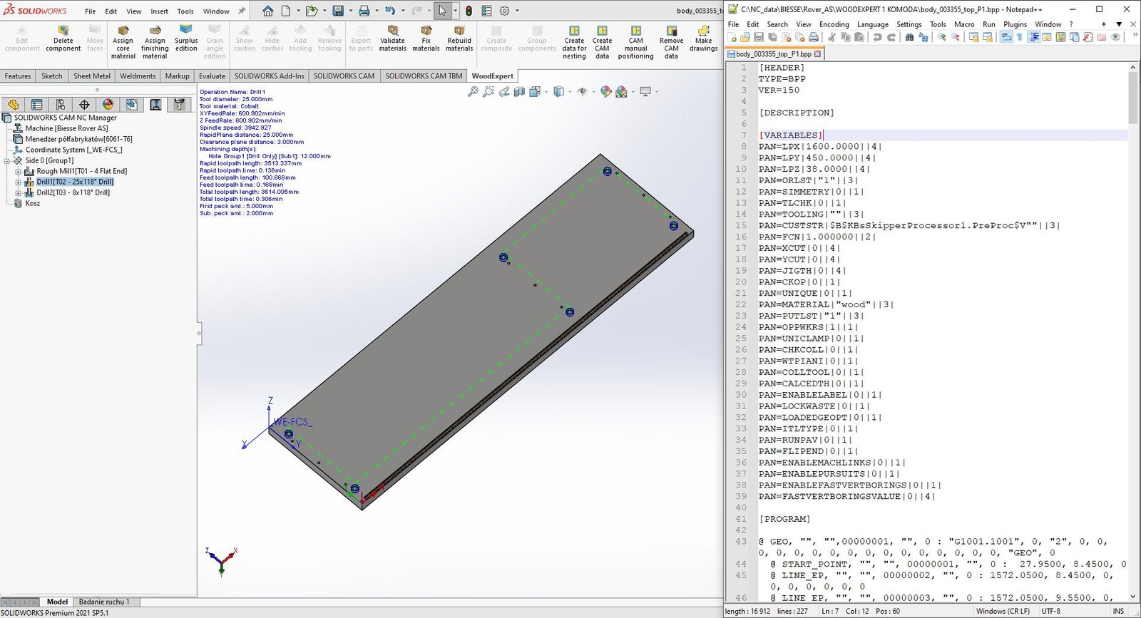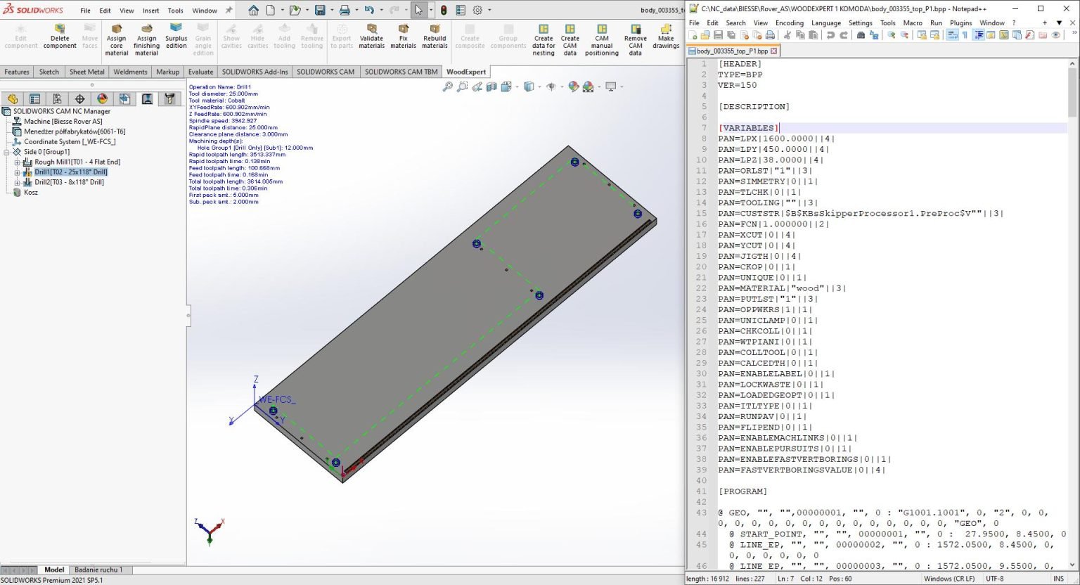 Η πλήρης ενσωμάτωση με το SOLIDWORKS επιτρέπει τη γρήγορη δημιουργία προγραμμάτων στο SOLIDWORKS CAM και την προετοιμασία του πίνακα κοπής στο NESTINGWORKS. Εκτός από την τρέχουσα βάση δεδομένων μεταεπεξεργαστών, το WOODEXPERT CAM είναι σε θέση να παράγει κώδικα NC για οποιαδήποτε μηχανή.